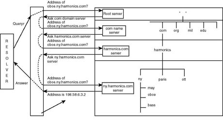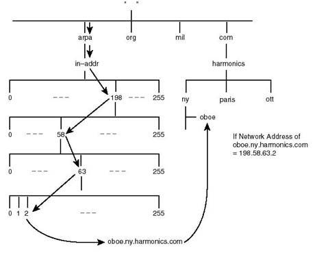 Name Service Resolution Process Whenever a name server is queried by a client, it is mandatory that the server responds with a valid answer regardless of whether the query pertains to the domain for which the server is authoritative or not. Queries pertaining to other domains, on the local network, or around the Internet should be forwarded to other servers for a response. To query name servers on behalf of the client, every name server must maintain pointers (that is, entries including the IP addresses) to the root servers. Root servers in turn must maintain data about all top-level domain, and so on. The process of querying other servers on behalf of a client is commonly known as a resolution referral process. Figure 20.27 illustrates the resolution referral process. In the diagram, a DNS server (somewhere in the Internet universe) receives a name query from a client. The query requests the IP address of host oboe.ny.harmonics.com.. Assuming that the server does not know the answer, rather than responding to the client with a negative response, it sends the query to a root server. The root server determines from the host name that it falls under the com domain. Consequently, it responds to the originating server with the address list of the com domain servers. The local server treats the response as referral to the com servers, at which point it redirects the query to one of these servers. In its turn, the com server determines that the queried object falls under the harmonics subdomain's authority and therefore refers the local server to contact the subdomain's server, which in turn finally refers it to the server of ny.harmonics.com for answer. Figure 20.27. Caching In order to save bandwidth and improve the response time it takes to answer a query, DNS defines a caching mechanism that allows name servers (of all types) to cache response data for future reference. In the example of Figure 20.27, the local name server caches the IP address-to-host name association of oboe.ny.harmonics.com after responding successfully to the client's query. This way, if queried for the same host (oboe.ny.harmonics.com), the server will be able to respond directly from its cache instead of undergoing the time consuming resolution referral process all over. Name servers do not just cache data pertaining to the query in effect. Rather, they cache all the data they discover in the process of responding to that query. For example, the local server in Figure 20.27 would cache all the referral data that led to the response to the query pertaining to host oboe.ny.harmonics.com. The referral data includes names and IP addresses of the servers that are authoritative for the root-level, com, and harmonic domains. Caching referral data cuts on the time that the referral process takes. In the event, for example, the name server is queried for host fake.somewhere.com, it does not have to start the referral process from the root level if it already has in its cache the necessary information to go directly to a com domain server for referral; thus cutting on the number of referral steps by one in this case. To avoid having a name server continue using cached data after it has expired (due to changes made to that data on authoritative name servers), DNS defines a time-to-live (TTL) configuration parameter for that data. After expiration of the specified TTL time, the server must discard the data in its cache and request an update from authoritative name server. Reverse Resolution of Pointer Queries Figure 20.28 shows a partial portrait of the organization of the Internet's global DNS service. Of particular interest is the in-addr.arpa reverse resolution domain. Called as such because it is used to reverse resolve an IP address to its fully qualified domain name. Reverse resolution is particularly useful for security. Some of the remote access services, such as rlogin and remote copy (rcp), are only accessible if the hosts from which users are attempting access are privileged to doing so. A host supporting such services normally maintains the names (not the IP addresses) of the other hosts allowed access in special files (such as $HOME/.rhosts and /etc/hosts.equiv ). Upon receiving a request for remote access service, a secure server issues a query to the name server requesting reverse resolving the address to its domain name for subsequent verification for eligibility to the service. The in-addr.arpa domain is designed to provide an efficient mechanism for responding to queries requesting reverse resolution. As shown in Figure 20.28, in-addr.arpa is simply another domain that uses IP addresses for subdomain names. The in-addr.arpa domain itself is organized into 256 domains, one corresponding to each possible value of the first byte of the IP address. Similarly, below each of those domains, there can be up to 256 subdomains corresponding to the second byte of the IP address, and so on, until the entire address space is represented in the in-addr.arpa domain. Figure 20.28. Whenever an organization joins the Internet, it is delegated the responsibility to administer two or more domains. These are the official domains that it registered under. For example, in the case of Harmonics, Inc. it is the harmonics.com domain, and the in-addr.arpa domain that corresponds to the address range that it has been assigned by the appropriate Internet authority. If, for example, Harmonics Inc. was assigned the Class C pool of addresses 198.58.63.0, then it is delegated the authority for managing the 63.58.198.in-addr.arpa domain. Notice how the IP address portion of the reverse domain is spelled backwards. This is in compliance with the DNS naming rules that were discussed earlier. For example, if the IP address of oboe.ny.harmonics.com is 198.58.63.2, its in-addr.arpa domain label becomes 2.63.58.198.in-addr.arpa, again in conformance with the way fully qualified domain names should be referenced. Assuming that a host receives a remote