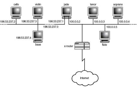 The above completes the list of the minimal requirements for the graceful implementation of TCP/IP on UNIX hosts. There are situations where configuring hosts may require additional information. Additional information can, however, always be implemented after all the above parameters are taken care of and the network setup is verified to work satisfactorily. TCP/IP Setup FilesInstalling and configuring TCP/IP involves several files that you are required to be aware of. Each of the files depicted below takes care of a certain aspect of the TCP/IP services rendered by the UNIX host. /etc/hosts The /etc/hosts file is where the host names to IP address associations are maintained. The following is an example of an /etc/hosts file as it is on host jade (see Figure 20.29): # # Internet host table # # IP address hostname aliases # 127.0.0.1 localhost 100.0.0.2 jade 198.53.237.1 jade1 # jade's second interface 100.0.0.3 tenor nfsserver # is my nfs server 100.0.0.5 alto # my gateway to the internet Figure 20.29. Text following the # character is ignored, and is meant to include comments and documentation. As shown above, every file entry consists of an IP address, the corresponding hostname, and optional aliases. Three entries in this file pertaining to host jade are of particular interest: