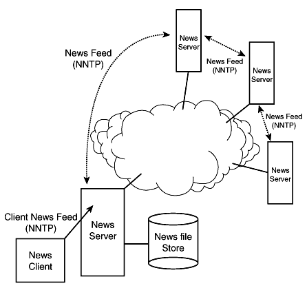 Where News Articles LiveNews articles arranged within the USENET hierarchy are commonly stored in a separate file system in a site's news server. This file system is often named /var/spool/news or /usr/spool/news. The files that contain articles are given serial numbers as they are received, with the periods in the newsgroup names replaced by the slash character (/). For instance, article number 1047 of the newsgroup comp.unix.solaris would be stored in the file /var/spool/news/comp/unix/solaris/1047. The News Overview Database (NOV)Newsreaders (and users) have a difficult job. Remember that more than 100 MB of news is posted to USENET every day. That's about the same as a fairly thick novel every day of the year, without any holidays. Most people want to have their favorite newsreader sift the wheat from the chaff and present them with only the articles they want to see, in some rational order. To do this, newsreaders must keep a database of information about the articles in the news spool; for instance, an index of subject headers and article cross-references. These are commonly known as threads databases. The authors of newsreaders have independently developed different threads databases for their newsreaders, and naturally, they're all incompatible with each other. For instance, if you install trn, nn, and tin, you must install each of their threads database maintenance programs and databases, which can take a lot of CPU cycles to generate and may become quite large. Geoff Collyer, one of the authors of C-news, saw that this was not good and created the News Overview Database (NOV), a standard database of information for fancy newsreaders. The main advantage of NOV is that just one database must be created and maintained for all newsreaders. The main disadvantage is that it hasn't yet caught on with all the authors of news software. If you're interested in NOV support, you must install news transport software that has the NOV NNTP extensions (INN does) and newsreaders that can take advantage of it. According to the NOV FAQ, trn3.3 and tin-1.21 have built-in NOV support, and there is an unofficial version (not supported by the author) of nn for anonymous ftp on the host agate.berkeley.edu in the directory ~ftp/pub/usenet/NN-6.4P18+xover.tar.Z. Distributing the NewsThe network News Transfer protocol is the application that is used to distribute news articles between news servers and clients. NNTP is an application level protocol--similar in operation and functionality to HTTP. As with HTTP, the NNTP application makes use of the reliable communication services that are provided by the TCP protocol. The following section examines the operation of the NNTP application and highlights how NNTP provides a mechanism for both the distribution of news throughout the USENET and enables user access to these "news" servers. Figure 25.1 below provides an overview of the architecture of the USENET. Figure 25.1. As Figure 25.1 indicates, the USENET network relies on the operation of NNTP servers acting as central data stores of news information. Users are granted access to this information through client programs known as newsreaders. Information is conveyed throughout the USENET through a process of server replication--known as a newsfeed. Access for both clients and servers occurs over established TCP connections via the well known port 119. Like the HTTP application protocol, NNTP uses a system of request and response messages to exchange information with both clients and servers. These messages are formatted using standard ASCII characters. Table 25.1 provides a summary of the standard request message commands. Table 25.1. Summary of USENET Request Message Commands.