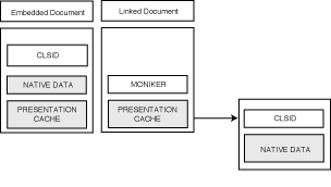 In OLE compound documents, an object and its native data can be stored in two ways (see Figure 13.3). They can be embedded in the document or linked to the document. In the embedding case, the object's CLSID, its native data, and a presentation cache are stored within the document. In the linking case, a moniker and a presentation cache are stored within the document. The moniker points to a file that contains the object's CLSID and native data.