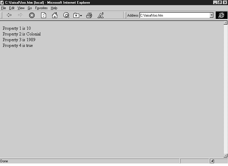 There are several things to notice about this object definition. First of all, the name of the function is the name of the object: house. Second, this function does not return anything. When functions were first introduced in Chapter 2 "JScript: The Language," it might have seemed mysterious how a function could actually do useful work without a return statement, because everything inside a function is local. Using a function to create an object works by modifying this, so that it need not return anything. You can also have the function return(this). Using this explicit return statement has the same effect as the code shown in Listing 4.1.