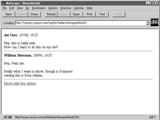 The changes in this script introduce one new CGI concept and a couple of new Perl commands. As pointed out earlier in this section, the URL in the Location box shown in figures 2.5 and 2.6 has additional information tacked on at the end. At first glance, this information might seem to be a bit odd. In figure 2.5, it appears that you're calling a script called 232 in the /CGI-BIN/HARLAN/SHOWGUESTBOOK2 directory. Clearly, that's not what's happening, though.