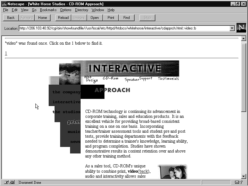 As in the nonindex search described earlier in this chapter, I want to be able to show the user where her search terms occurred in the returned documents. Unfortunately, I can't use the same showfoundfile script, because in the index search, the search string is interpreted as a list of words, rather than a single phrase. When a user executes a search and selects a file from the resulting list, figure 5.4 shows what she would see.