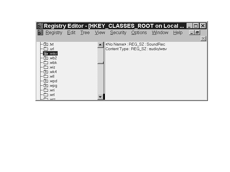 In HKEY_CLASSES_ROOT, the extension for a wave sound is listed as .WAV.