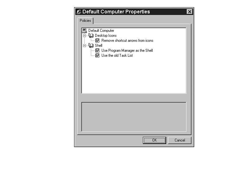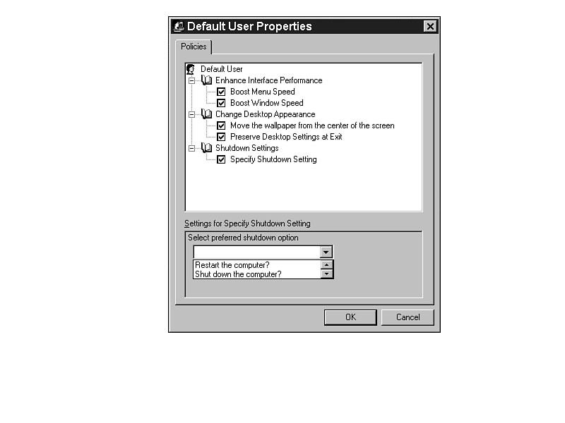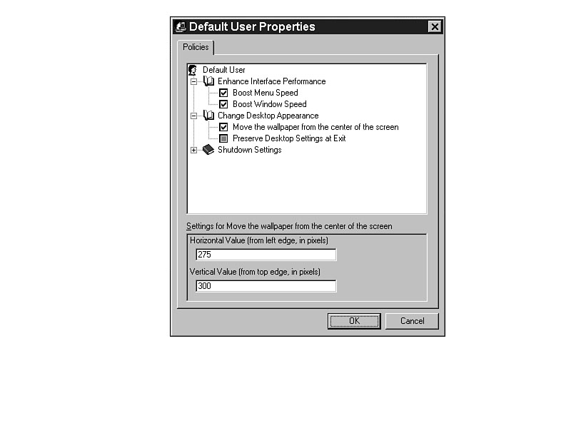 Every time you exit Windows, you can set it to the same option with the Shutdown setting in the System Policy Editor. The ITEMLIST entry in Listing J.1 produces the lists shown at the bottom of Figure J.4. The CLASS MACHINE settings in INTERFACE.ADM create the settings for the computer, as shown in Figure J.5. Figure J.3. Offset the wallpaper for better viewing. Figure J.4. Set the shut-down settings for consistency. Figure J.5. Computer-based settings allow system customization.