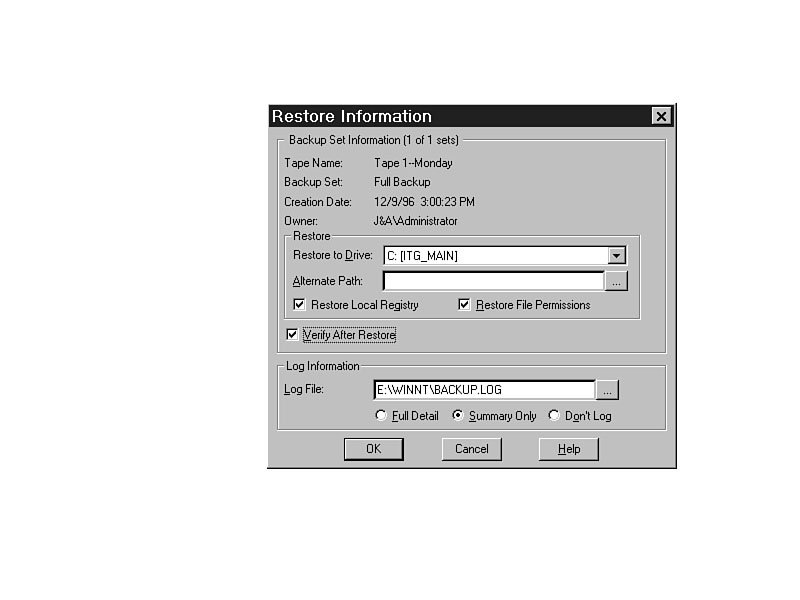 would like to use. If you want to restore only part of the current tape set (only some of the directories or files), double-click the tape-set name. NT Backup performs a Catalog Status procedure to list all the files that are contained on the tape. This procedure is very similar to a DIR command in DOS, except that it takes longer. Select and deselect files as necessary (as Figure 5.4 illustrates). After you choose the files and directories, confirm the options for the restoration with Operations | Restore. If you want the Registry to be restored to the local system, you must select it in the dialog box shown in Figure 5.5. Selecting the files in the catalog is not enough. If you do not select Restore Local Registry from the Restore Information dialog box, you will receive a File in Use error, and the files will not be restored. Figure 5.4. Choose which directories and files will be restored. Figure 5.5. The Restore Information dialog box.