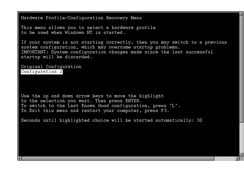 There is an important difference between choosing the default configuration and choosing Last Known Good. If you choose the default configuration, you are returned to the last saved Registry and given options for the hardware profiles. If you choose Last Known Good, you get the Registry that was copied during the last startup for each of the profiles that was used. Your original configuration profile might be from yesterday, but your other Last Known Good profiles might be from some time ago!