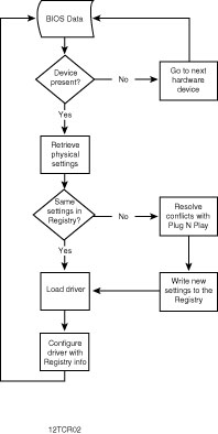 The Registry plays a key role in making all the devices work. If the Registry is corrupted, and the settings are not available, the device will not work. Figure 12.2. Windows NT hardware settings resolution process.