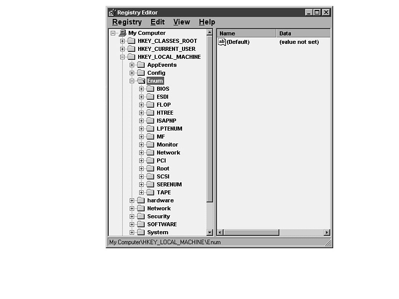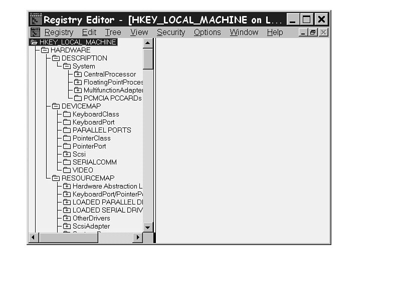 Figure 12.3 shows a cascading view of HKEY_LOCAL_MACHINE with DESCRIPTION, DEVICEMAP, and RESOURCEMAP open. These three subkeys hold the settings and control information for the hardware. DESCRIPTION supplies data to NT about the system board, the processors, and the bus. DEVICEMAP either directly holds data and settings about the devices connected to the bus or supplies a description and location of a driver. RESOURCEMAP holds settings for many of the drivers for the devices. Seldom would you ever make settings here. Instead, you would make all the settings in Control Panel, and then Control Panel would store them in these keys for use by Windows NT, and for viewing by Windows NT Diagnostics. Figure 12.3. HKEY_LOCAL_MACHINE in the NT Registry controls all hardware.