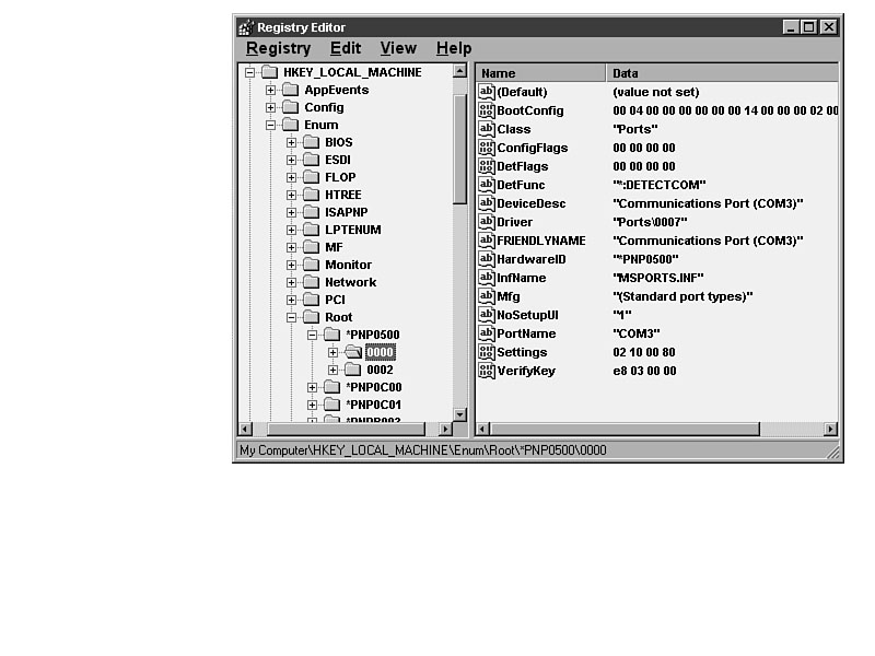 When Plug and Play sets the configuration, it is stored in HKEY_DYN_DATA and then copied to HKEY_LOCAL_MACHINE as a backup. In HKEY_LOCAL_MACHINE, the configuration information is held in HKEY_LOCAL_MACHINE\Enum\Root for most devices. Figure 12.5 shows the binary Settings value, indicating that it has been set through Plug and Play. Figure 12.5. Binary Settings information for COM3.