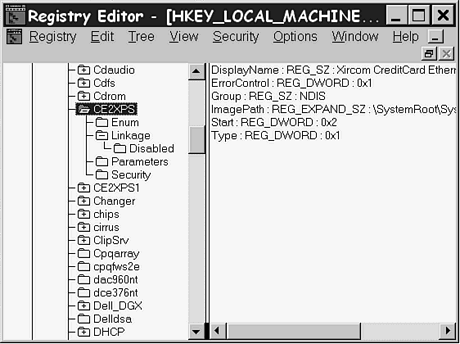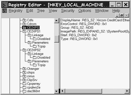 Even though the system will restart as Workstation, the fault tolerance will work perfectly. You can do the same thing to allow the installation of Internet Information Server or SQL Server on a Workstation. The difference between NT Server and NT Workstation is really only one of focus. The underlying functions are identical. This chapter divides the Registry information for Windows NT into common settings, NT Server networking settings, and NT Workstation settings. Obviously, if you are going to use your server as a non-dedicated server to run applications locally, you may want to implement more of the Workstation settings than normal. Likewise, if you are going to use your workstation as a server, either in a workgroup or a domain, you may want to change the tuning. Common SettingsThe settings that are common to both NT Workstation and NT Server deal mostly with the drivers and the protocols. Driver SettingsThe network card driver information in the Registry in Windows NT is in HKEY_LOCAL_MACHINE\ Figure 18.2. Registry entries for the Xircom CreditCard Ethernet Adapter IIps network card.