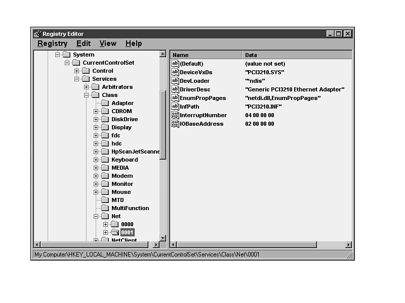 -19-Windows 95 Networking and the RegistryWindows 95 treats networking very differently than Windows NT. In relative terms, compared to the security and integration of networking with NT, Windows 95 networking feels "tacked on." Windows 95 was designed as a desktop operating system, with networking added. Security features are not as strong, but then again, Windows 95 works as a desktop system with fewer hardware requirements, and it has more backward compatibility than Windows NT. Networking functions in 95 are very similar in components to NT Workstation, where the focus is on local applications, then client connections to servers, and then sharing disk drives and printers with others. Network Cards and DriversBecause Windows 95 has Plug and Play, it automatically detects new network cards that have been inserted into the system and loads the drivers for them. The driver information will be in HKEY_LOCAL_MACHINE\Enum\PCI for PCI-based cards or HKEY_LOCAL_MACHINE\Enum\ISAPNP for all ISA-based cards or HKEY_LOCAL_MACHINE\Enum\PCMCIA for PCMCIA network cards. There will be a code for the vendor of the network card, and under it, a code for the card will be listed. The settings for the card are in binary code, so it makes it very difficult to set the cards through the Registry. Details for the drivers are in HKEY_LOCAL_MACHINE\System\CurrentControlSet\Services\ Figure 19.1. Settings for the 3210 Generic PCI Network Adapter.