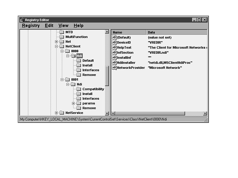 Client ConnectionsAs in Windows NT, you can have multiple client connections simultaneously to different networks. The two that are the most common are clients for Microsoft networks and clients for NetWare networks. The NetWare client will support both bindery services (NetWare 3.12 and earlier) and NDS (NetWare 4.0 and later). Information about the Microsoft client is in HKEY_LOCAL_MACHINE\Enum\Network\Vredir, and information about the NetWare client is in HKEY_LOCAL_MACHINE\Enum\Network\NWRedir. The settings for the clients are also in binary code, making it very difficult to edit here. Specific details of the clients are in HKEY_LOCAL_MACHINE\System\CurrentControlSet\Services\Class\NetClient, with the individual clients listed with 0000 and 0001 keys. The values in those keys name the exact location of the driver files. In my system, the client for Microsoft networks is 0000, and the client for NetWare is 0001. One of the most important settings is the default client. Figure 19.2 shows that 0000, or the Microsoft client, is the default. You can also set that in the Control Panel. It is critical because it determines which network will be logged onto first, and which logon script will have precedence. Figure 19.2. Settings for the clients in the Registry.