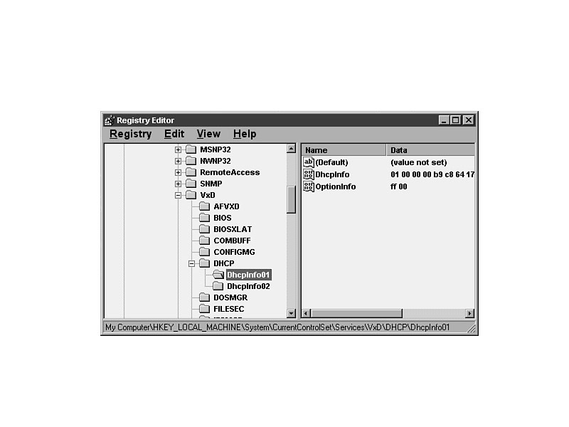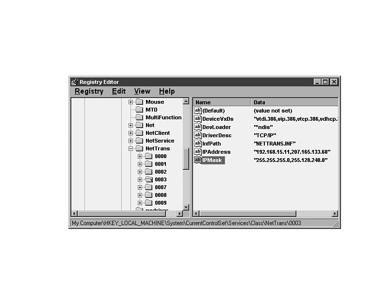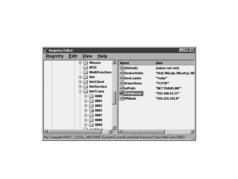 NetTrans key. Find the subkey that holds the IP address. Figure 21.2 shows the