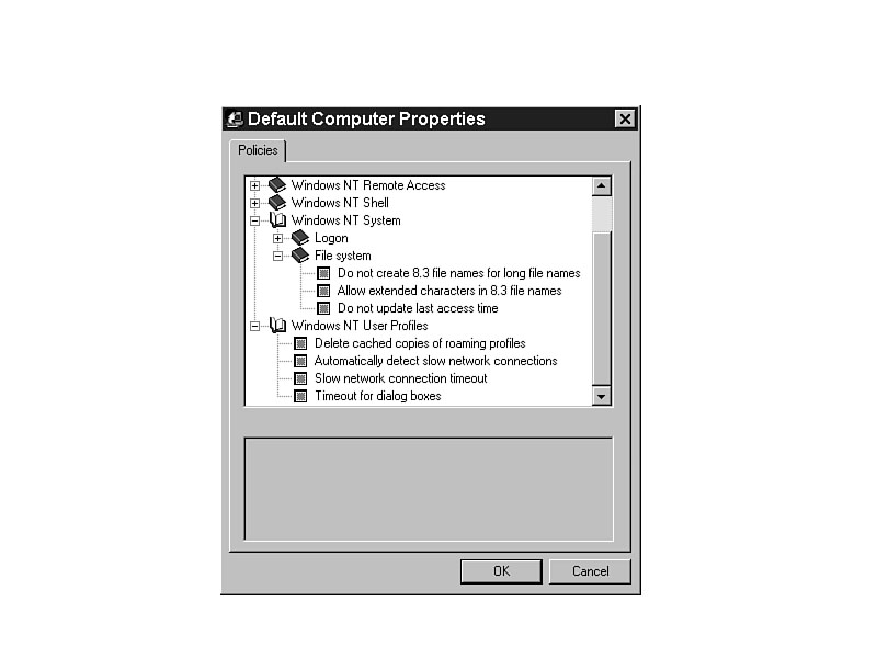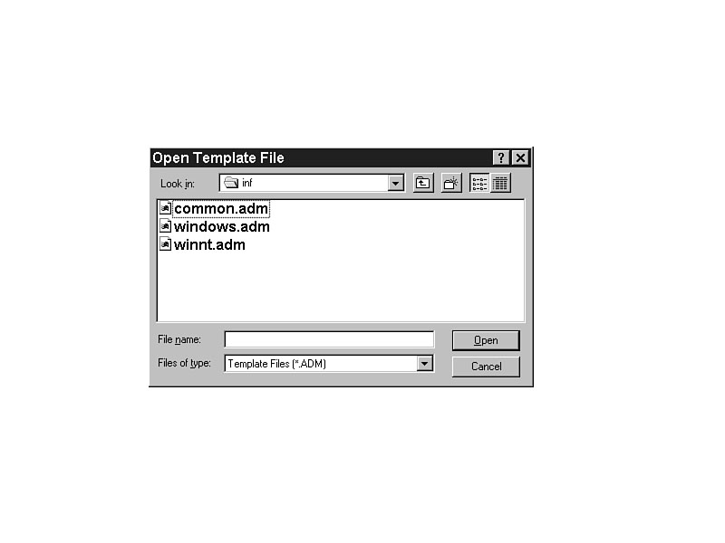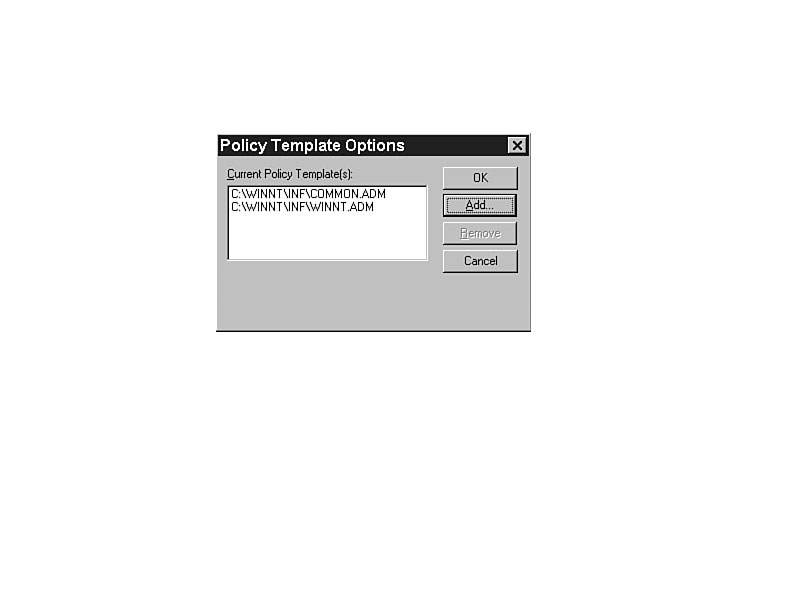 Default Templates in Windows NT 4.0Three default templates come with Windows NT 4.0: COMMON.ADM, WINNT.ADM, and WINDOWS.ADM. Because the System Policy Editor does not work with Windows 95 systems, the WINDOWS.ADM file will not be discussed in depth here. It was developed so it could be used in creating a single policy for both NT and 95. It actually has no value now because the policies are not compatible.
