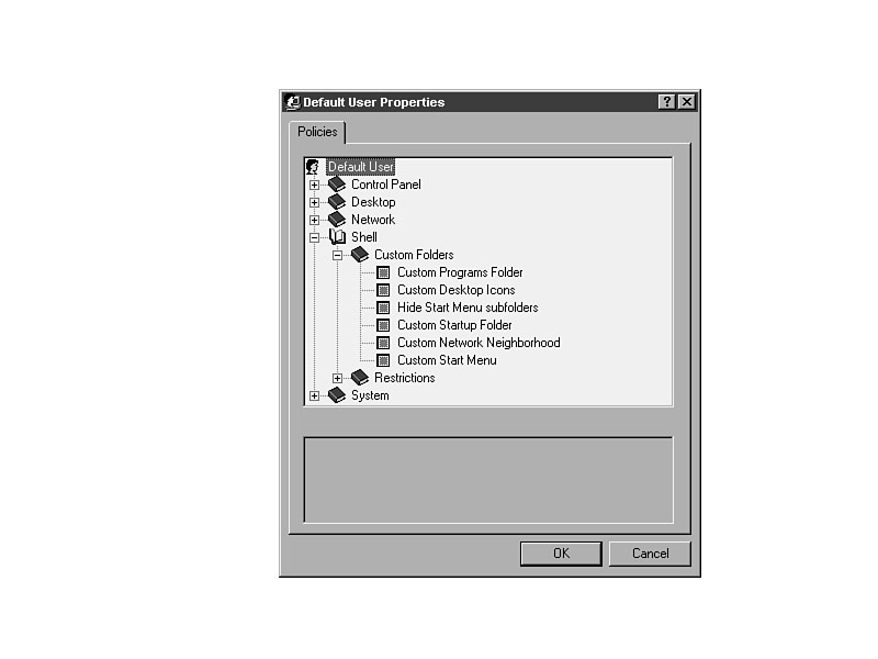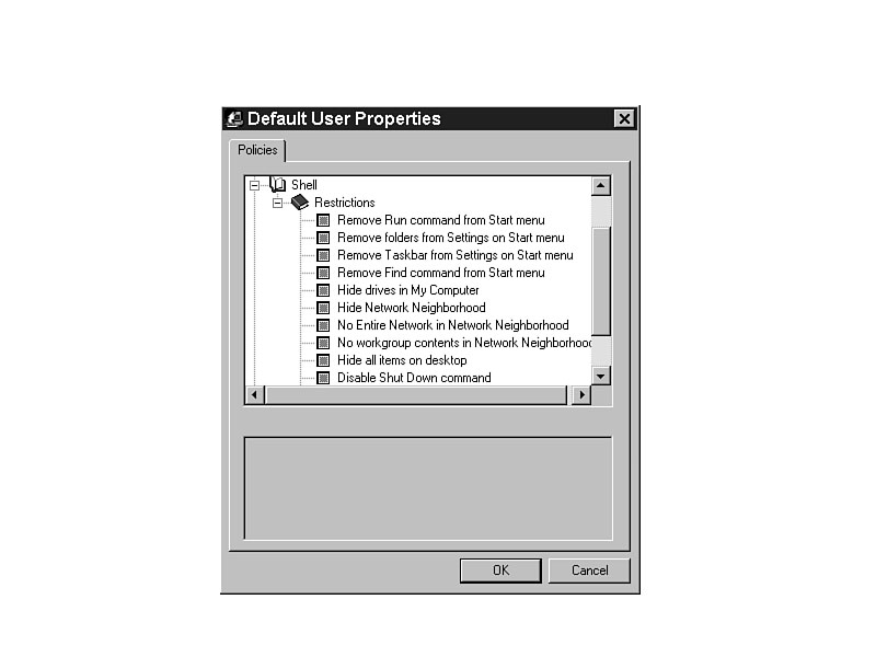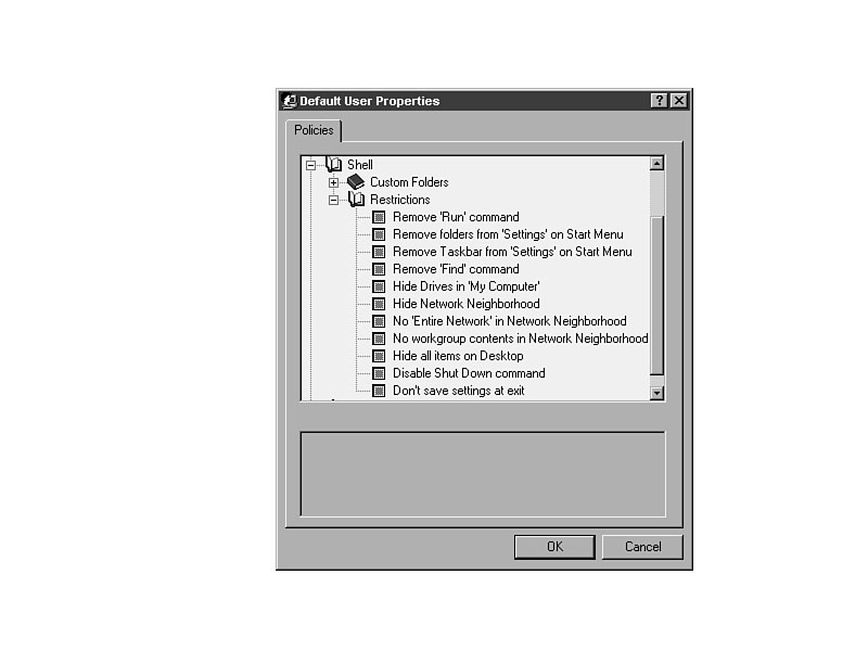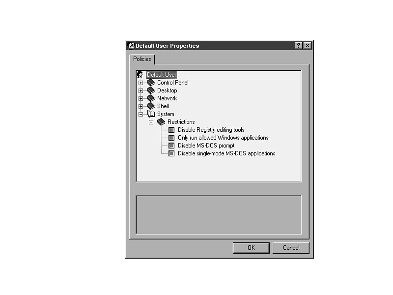 As you can see in Figures 29.7 and 29.8, many more entries are associated with users than with the computers in COMMON.ADM. Most of the system-specific entries are also associated directly with the operating system. Figure 29.6. System-specific entries in COMMON.ADM. Figure 29.7. User-specific entries in COMMON.ADM. Figure 29.8. User-specific Shell Restriction entries in COMMON.ADM.