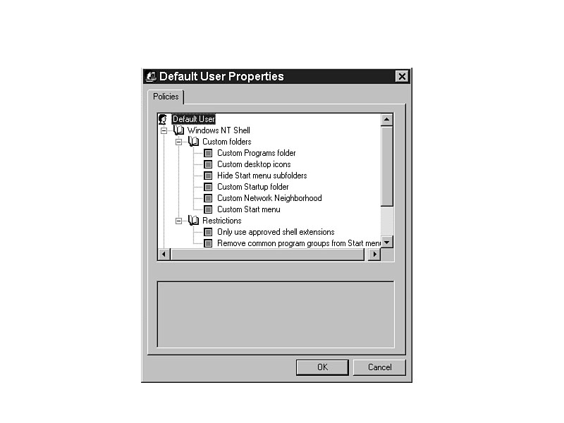 Together, COMMON.ADM and WINNT.ADM provide the framework for settings for system and user restrictions with System Policy Editor. Figure 29.12. User options in WINNT.ADM. Figure 29.13. More user options in WINNT.ADM.