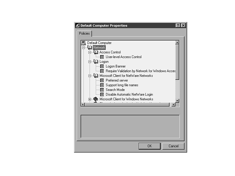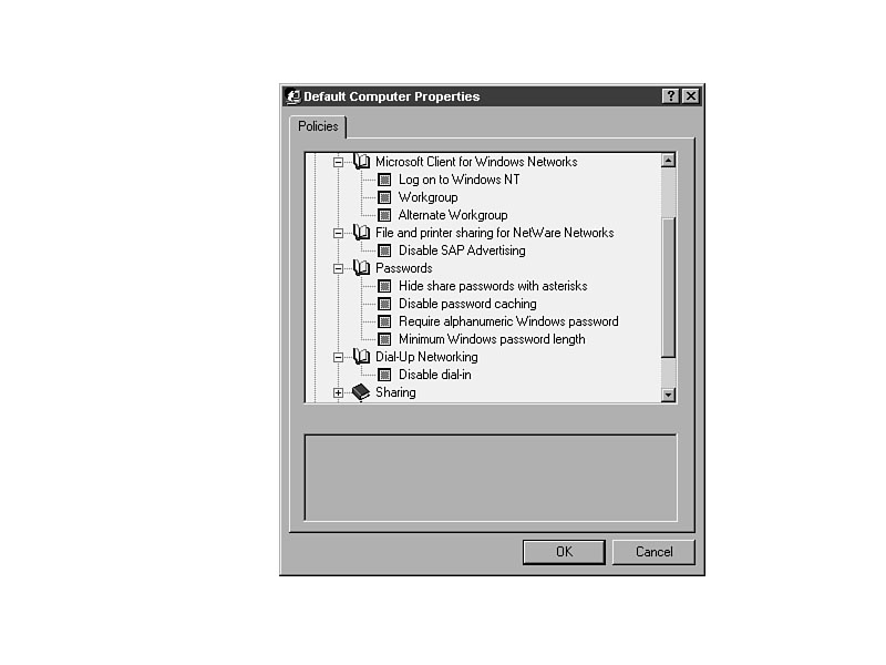 Default Template in Windows 95Windows 95 uses the template called ADMIN.ADM. It has the same entries as COMMON.ADM in Windows NT, plus more. Those additional entries were included in Windows NT as WINDOWS.ADM. Like the template files in NT, ADMIN.ADM contains settings for both system and user Registries. Using ADMIN.ADMADMIN.ADM was the first of the template files for the System Policy Editor. It is exclusive to Windows 95, although there are some overlapping entries![Ydieresis]th the COMMON.ADM template in NT 4.0. This template is critical to proper management of Windows 95 systems in organizations where any sort of standardization and security is required. Without the imposition of a policy, Windows 95 users can do nearly anything they want to, much to the chagrin of system administrators and technical support. The options for computer-based system policies are illustrated in Figures 29.14 through Figure 29.17. Additional detail about each of the settings is in Chapter 33, "Managing Windows 95 Users with System Policy Editor." Figure 29.14 shows the available policies for Network access control, logon functions, and the NetWare client. Figure 29.15 shows the Microsoft client policy options, plus the options for File and Print sharing for NetWare networking, passwords, and dial-up network restrictions. Sharing functions in Microsoft networking, SNMP, and policy file location (Remote Update) functions are shown in Figure 29.16. Figure 29.14. Some of the computer policies in ADMIN.ADM. Figure 29.15. Computer policies in ADMIN.ADM affect client policy options. Figure 29.16. Computer policies in ADMIN.ADM affect sharing and SNMP.