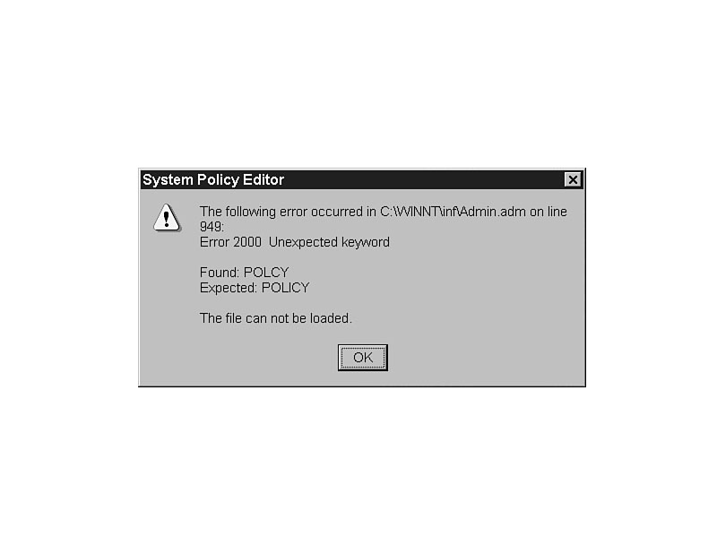 Figure 33.2. Error dialog when opening an edited ADMIN.ADM. Imagine having to find the error by the line number. In this case, it wouldn't be that hard to fix in a word processor, searching for the word "Polcy" and replacing it with "Policy." Other errors may not be so simple.