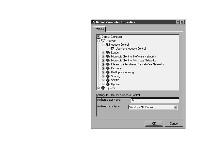 Computer-Based Settings in ADMIN.ADMMany of the settings for Windows 95 systems are different than those of Windows NT. There are controllable features that NT simply doesn't have. Most of the entries in ADMIN.ADM are based on those unique features. The features that are the same as Windows NT, and share the same Registry setting, are in the NT template called COMMON.ADM. The entries that are the same in Windows 95's ADMIN.ADM and Windows NT's COMMON.ADM are listed in Listing 33.1 (for computer-based settings) and Listing 33.2 (for user-based settings), and are discussed in detail in Chapters 31 and 32. Detailed descriptions are presented here for the unique settings only. Listing 33.1. Computer settings in ADMIN.ADM that are also in COMMON.ADM.Default Computer/Network/Logon/Logon banner Default Computer/Network/SNMP/Communities Default Computer/Network/SNMP/Permitted Managers Default Computer/Network/SNMP/Traps for `Public' Community Default Computer/Network/Update/Remote Update Default Computer/System/Run Listing 33.2. User settings in ADMIN.ADM that are also in COMMON.ADM.Default User/Control Panel/Display/Restrict Display Control Panel Default User/Desktop/Wallpaper Default User/Desktop/Color Scheme Default User/Shell/Custom Folders Default User/Shell/Restrictions Default User/System/Restrictions/Disable Registry Editing Tools Default User/System/Restrictions/Run only allowed Windows applications For more details on these entries, see the corresponding entries in Chapters 31 and 32. The balance of the settings in this chapter are unique to ADMIN.ADM and Windows 95 systems and users. Network/Access Control/User-Level Access ControlWith this setting, Windows 95 systems will look for logon validation from a Windows NT server or NetWare server, as shown in Figure 33.7. A single password would then allow the user access to shares on the network based on user rights assigned at the server. The default is share-level access control, where a password is assigned to every share. Figure 33.7. Setting access to the network based on user-level rights.