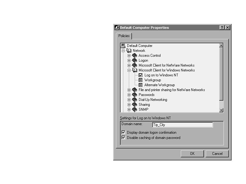Network/Logon/Require Validation by Network for Windows AccessWithout this setting shown in Figure 33.8 turned on, users could press Esc at the logon dialog box and enter Windows NT, even though they could not access network resources. Figure 33.8. Preventing the circumvention of network logon.Network/Microsoft Client Service for NetWare Networks/Preferred Server