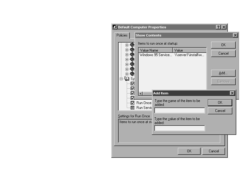 System/Run OnceSimilar to the Run function that is available in both Windows 95 and NT, the Run Once command allows the system administrator to add applications that will be run, but when completed will never be run again. This is particularly helpful in upgrading applications, adding a service pack (OS update), or polling the user for input. Figure 33.22 shows the options available. Figure 33.22. Items to be run only once on the system.