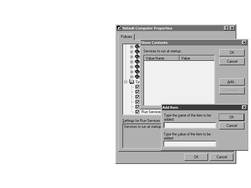 In turn, open the Registry of every machine with File | Connect and repeat steps 3 through 9 for each one. Allowing Policies to Update Windows 95 SystemsIn order for a Windows 95 system's Registry to be updated by System Policy Editor, that system must have Remote Administration enabled, and it must be running the Remote Registry Service. Add the Remote Registry ServiceRemote Registry Service does not automatically get installed with Windows 95. To install the service, which is available only on the CD-ROM, do the following: