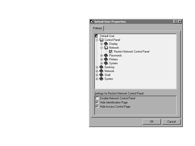 Control Panel/Network/Restrict Network Control PanelWith this setting, you can disable the entire Network Control Panel, hide the Identification tab, or hide the Access Control tab. Figure 33.24 illustrates the options. The Identification tab allows you to change the name of the system and workgroup, and the Access Control tab allows you to choose between share-level and user-level access control. Figure 33.24. Setting levels of access to the Network Control Panel.