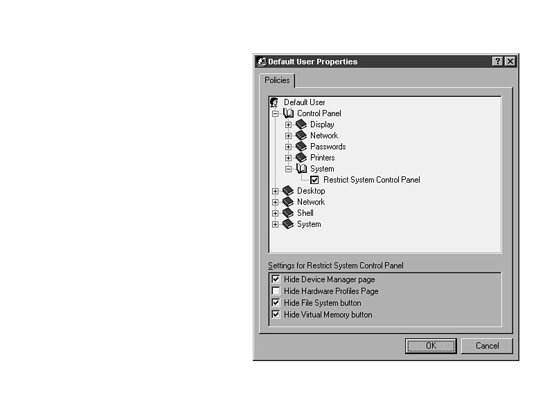 Control Panel/Printers/Restrict Printer SettingsFigure 33.26 shows the options for restriction of access to the Printers Control Panel applet. It can be fully restricted, or limited to changing the properties, or adding or deleting printers. Control Panel/System/Restrict System Control PanelChanging the settings of hardware in your system is done through the System section of the Control Panel. To ensure that your users do not change critical settings, invoke all of these options, as shown in Figure 33.27. Figure 33.26. Restricting access to Printer settings. Figure 33.27. System settings in the Control Panel.