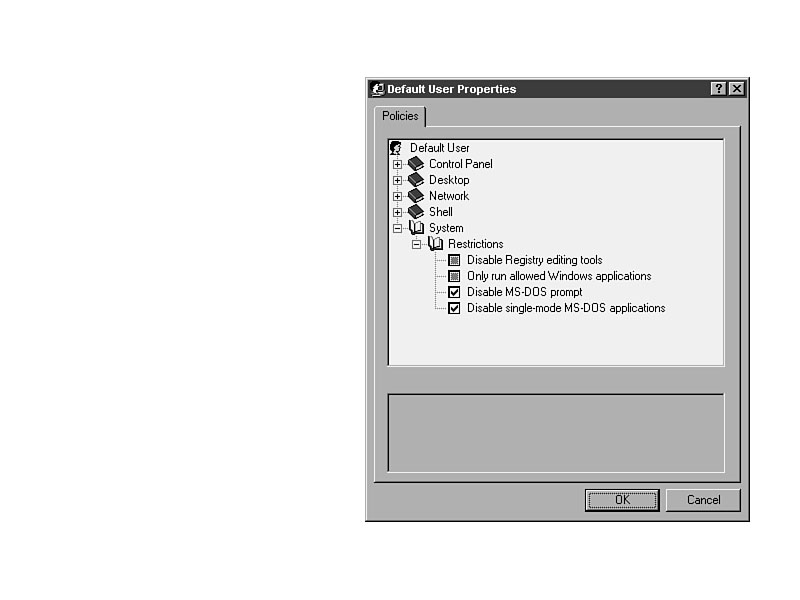 User-Based Settings in ADMIN.ADMThere is much more control available for users in Windows 95 than in Windows NT 4.0. Maybe that is because Microsoft expected more novice users to use 95 than NT. Whatever the reason, if all the user restrictions in ADMIN.ADM were implemented, the user would probably quit and go elsewhere, somewhere that offered him some personal choice. These settings allow the administrator to restrict access to features to improve security, stability, and reliability of the system.