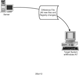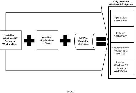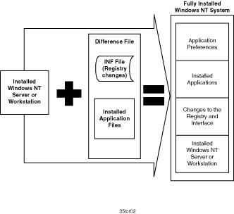 The best option is to take a currently setup system, get everything exactly as you would like it, and clone it (except for the SIDs discussed previously). Then you could use that procedure over and over to make your installation work more easily, faster, and error-free. What you want to achieve is shown in Figure 35.1. In the past, Computer Profile Setup was included with the Windows NT 3.51 Resource Kit. Unfortunately, even though it did a passable job, it had too many limitations, particularly in relation to long filenames and hardware differences. It was difficult to use, and didn't always create unique SIDs for the systems. The complexity and undependable results made it unusable for most organizations. Now, however, SYSDIFF.EXE is available to help you clone your system. Figure 35.1. A fully installed system. SYSDIFF.EXENT 4.0 Server offers a new deployment tool called SYSDIFF.EXE, which is designed to allow quick and easy system cloning. SYSDIFF.EXE does not install or help install the operating system--just all of the modifications, applications, and changes. It can help make the necessary interface changes and connections to the network and shares. It can also help install the application files and implement the necessary Registry changes associated with those files. SYSDIFF.EXE allows you to perform these tasks in two ways. You can combine the changes to the Registry with the binary files required to run the applications into one item called a difference file (it is the difference between the original system and the system after all modifications), then copy the difference file to the new system. That process is outlined in the section titled "Cloning Step by Step." An illustration of this method is shown in Figure 35.2. Alternatively, you can use the cloning tool to make only Registry changes, which will create an .INF file. You then copy the actual files another way, by performing a backup-and-restore or by recording the files on a CD-recordable drive, and copy them to the target system. That option is outlined in the section titled "An Alternative Procedure for Installing Files on the Target System." Figure 35.3 illustrates this type of installation. Whether you include all the actual programs and auxiliary files or not, when you decide to clone your system, the most critical part is the Registry. Figure 35.2. Easy installation with a difference file. Figure 35.3. Using separate application and .INF files for a clone installation.