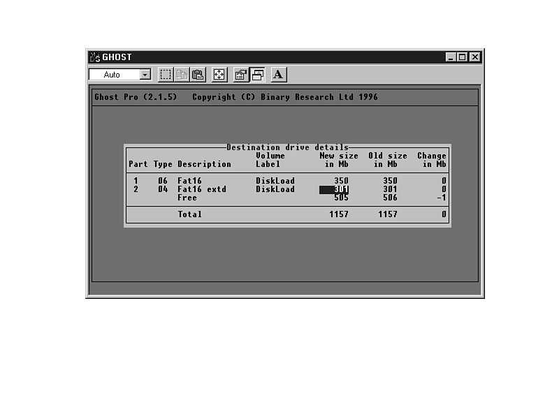 - 8. Select the new partition size, and press Enter. GHOST will re-allocate