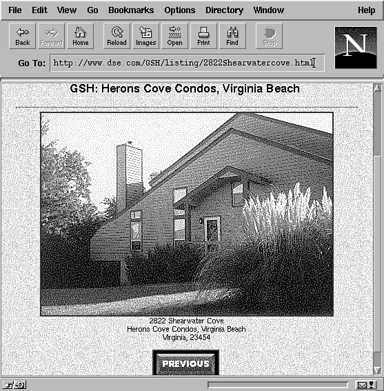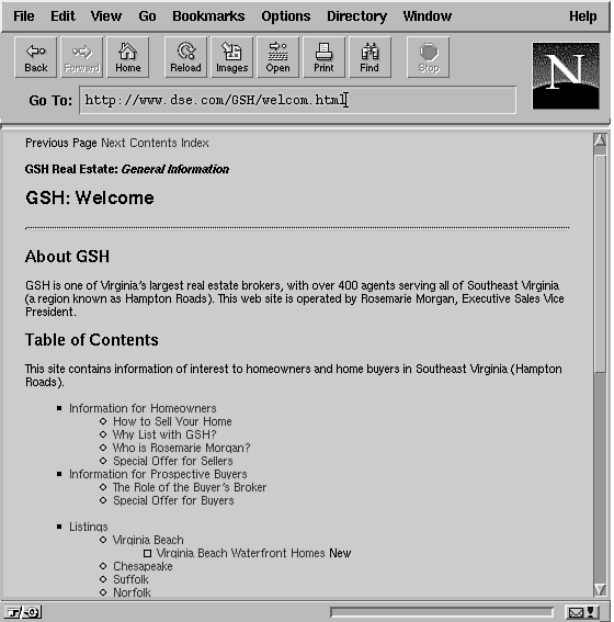 Effectiveness, of course, is more difficult to pin down. It's tough to define and even tougher to get the hard data needed so that effectiveness can be measured. As the sample site, this book uses a site for which hard data is available: a real estate broker's site. Some of the details of this site have been simplified to make the points of each chapter clear. The reader can visit the live site at http://www.dse.com/gsh/ to compare the chapter examples with what is actually on the Web.