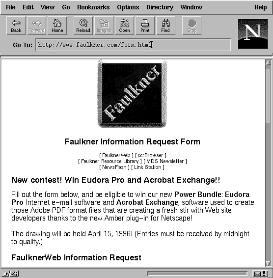 From a technical standpoint, a simple sweepstakes may be set up using a form linked to e-mail using a CGI script. formmail, from Matt Wright's Script Archive at http://www.worldwidemart.com/scripts/, is one such script. Visit Faulkner's Online Sweepstakes (see Fig. 11.1) at http://www.faulkner.com/form.html for a simple, effective sweepstakes.