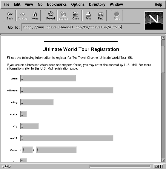 A more elaborate example (still built using a mail form) is the Travel Channel's Ultimate World Tour '96 (see Fig. 11.2), at http://www.travelchannel.com/tv/travelus/ult96/. Travel Channel sponsors this contest each year, suggesting that the giveaway is meeting its expectations.