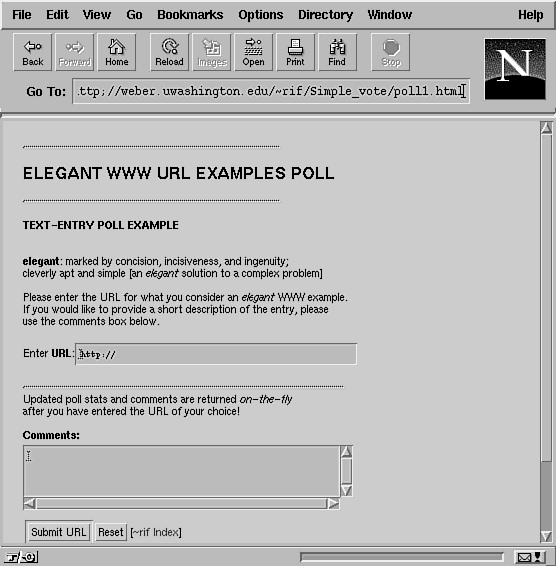 Listing 11.2 shows a similar program from the same author; this one captures text-based data. It works with the HTML form at http://weber.u.washington.edu/~rif/Simple_vote/poll.html. Figure 11.5 shows that form.