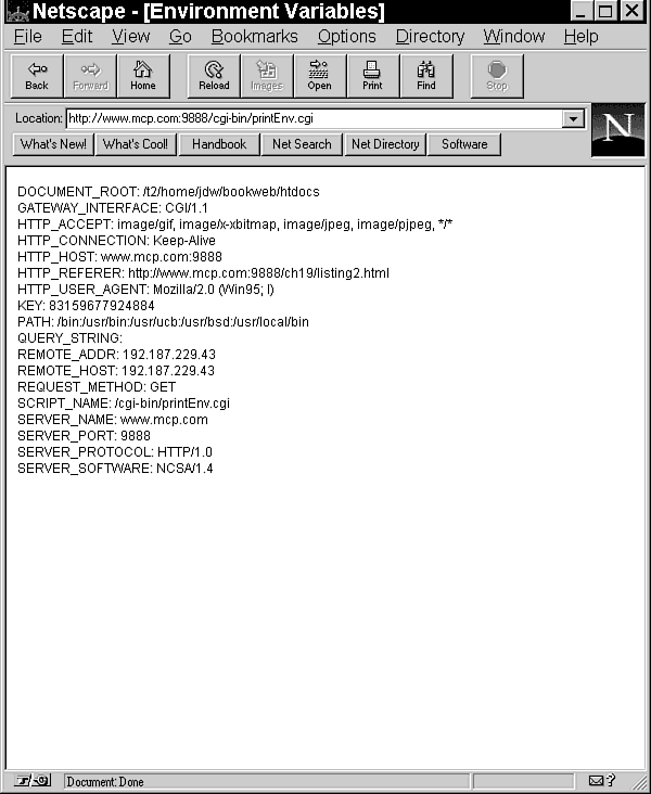 <HTML> <TITLE>Environment Variables</TITLE> <BODY bgcolor=ffffff> DOCUMENT_ROOT: /t2/home/jdw/bookweb/htdocs<br> GATEWAY_INTERFACE: CGI/1.1<br> HTTP_ACCEPT: image/gif, image/x-xbitmap, image/jpeg, image/pjpeg, */*<br> HTTP_CONNECTION: Keep-Alive<br> HTTP_HOST: www.mcp.com:9888<br> HTTP_REFERER: http://www.mcp.com:9888/ch19/listing2.html<br> HTTP_USER_AGENT: Mozilla/2.0 (Win95; I)<br> KEY: 83139635424884<br> PATH: /bin:/usr/bin:/usr/ucb:/usr/bsd:/usr/local/bin<br> QUERY_STRING: <br> REMOTE_ADDR: 192.187.229.43<br> REMOTE_HOST: 192.187.229.43<br> REQUEST_METHOD: GET<br> SCRIPT_NAME: /cgi-bin/printPrintEnv.cgi<br> SERVER_NAME: www.mcp.com<br> SERVER_PORT: 9888<br> SERVER_PROTOCOL: HTTP/1.0<br> SERVER_SOFTWARE: NCSA/1.4<br>