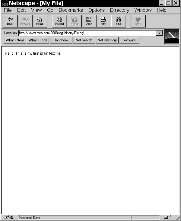 Like magic, the pages are created in that the page is downloaded to the client just as any other static page is loaded by a client. Web browsers are client programs that do interesting things. We have browsers that can read e-mail, UseNet groups, even play sound and video. But behind all those features, the browser is an HTML viewer. The browser accepts all kinds of documents: GIFS, Shockwave pieces, sound files, and HTML files. Pages generated by CGI scripts are made on the fly the instant the user loads a CGI script URL.