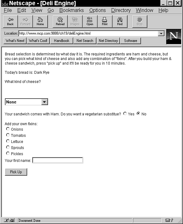 <html> <title>Deli Engine</title> <body bgcolor=ffffff> Bread selection is determined by what day it is. The required ingredients are ham and cheese, but you can pick what kind of cheese and also add any combination of "fixins". After you build your ham & cheese sandwich, press "pick up" and it'll be ready for you in 10 minutes. <form method=post action="/cgi-bin/hamcheese.cgi"> Today's bread is: <!--#exec cmd="/export/home/jdw/bookweb/bin/bread-selector.pl" --> <p> What kind of cheese? <select name="cheese"> <option value="None:0.0">None<BR> <option value="Cheddar:0.50">Cheddar<BR> <option value="Swiss:0.50">Swiss<BR> <option value="Harvarti:1.00">Creamy Havarti<BR> </select> <p> Your sandwich comes with Ham. Do you want a vegetarian substitue? <input name="noMeat" value=1 type="radio">Yes <input name="noMeat" value=0 type="radio" checked>No <p> Add your own fixins:<BR> <input name="onions" value="Onion:0.25" type="radio">Onions<BR> <input name="tomatoes" value="Tomatos:0.50" type="radio">Tomatos<BR> <input name="lettuce" value="Lettuce:0.10" type="radio">Lettuce<BR> <input name="sprouts" value="Sprouts:0.40" type="radio">Sprouts<BR> <input name="pickles" value="Pickles:0.25" type="radio">Pickles<BR> Your first name: <input type="text" name="customerName"><P> <input type="submit" value="Pick Up"> </form>