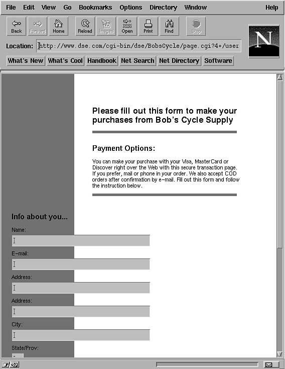 Once users leave catalog.cgi, they move to the first product page in the site. The product page may have a single product or more than one. If the product information is simple, all the information can be stored in the URL. If the user has options to choose, the page can be implemented as a series of forms. Listing 27.3 shows the HTML for a simple product: