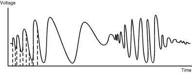 Figure 34.1 shows that the incoming analog voltage from a microphone varies by frequency as well as by level. The frequency corresponds to pitch or tone, and the level corresponds to volume. Since computers are much more comfortable with numbers than they are with varying voltages, the signal is sampled to get a file of numbers.