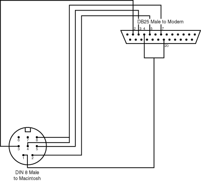 Figure 34.6 shows the necessary connections to allow a Macintosh to exercise hardware flow control over the modem. Pin 1 on the Macintosh DIN 8 connector is called HSKo and is connected to pin 4 (RTS) and pin 20, data terminal ready (DRT), at the modem. Pin 2 on the Macintosh DIN 8 connector is called HSKi. It is connected to pin 5 (CTS) at the modem.