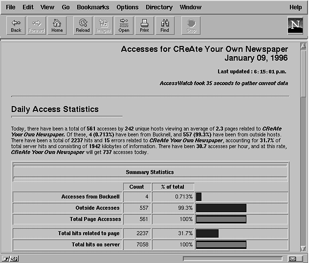 This Perl script looks at the data a bit differently than many of the programs and scripts described earlier. It follows many of the same statistics as other analyzers but makes heavy use of graphical output. The Uppsala team analyzed AccessWatch, although not as part of its major study. The team found AccessWatch to have a throughput well under one percent of GetStats-around 48 lines per second, compared to GetStat's 21,000 lines per second. See the sample output in Figures 42.7 and 42.8. AccessWatch is available at http://www.eg.bucknell.edu/~d/.