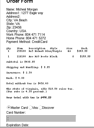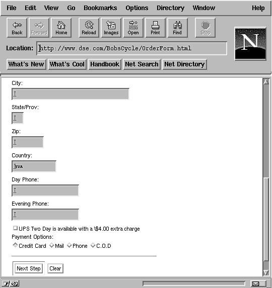 Note that, if the contact information from the last form is stored in the cookie, it is pulled out and put into the associative array FORM. This way, the rest of the processing is the same whether cookies were available or not. Until cookies become universal, there is not much advantage in using cookies, since each script has to handle the non-cookie case as well. As the number of visitors who have cookie-aware browsers like Netscape Navigator 2.0 continues to increase, the Webmaster may decide to drop support for non-cookie-aware browsers. When that happens, this code can be simplfied.