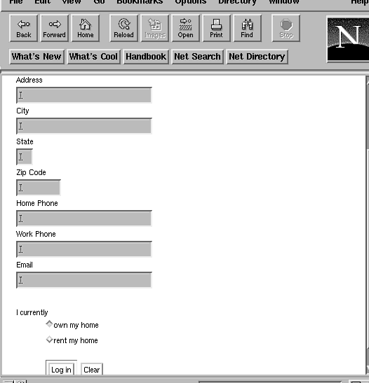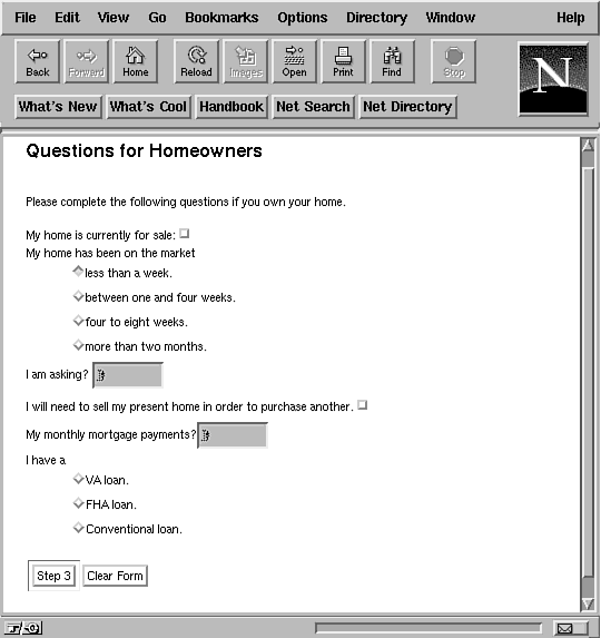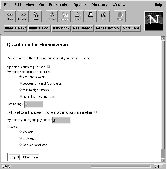 If the user is a renter, you can capture relevant information into the cookie, or the hidden fields, as shown in step3.cgi. The renters page is shown in Figure 9.16. Then send out page 3, which asks a list of questions about the buyer's housing preferences. The same script reads the homeowner's; it captures the information and transfers control to page 3.