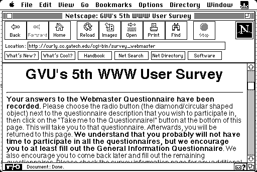 The GVU staff elected to implement their questionnaire as a multipart form. Each page contains hidden fields that help the software link together the responses of a user.