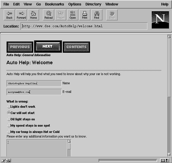The first screen (refer to Fig. 9.5) asks the user about general symptoms. Suppose the user says the car won't start. When the user submits the page, the system considers two possible scenarios: