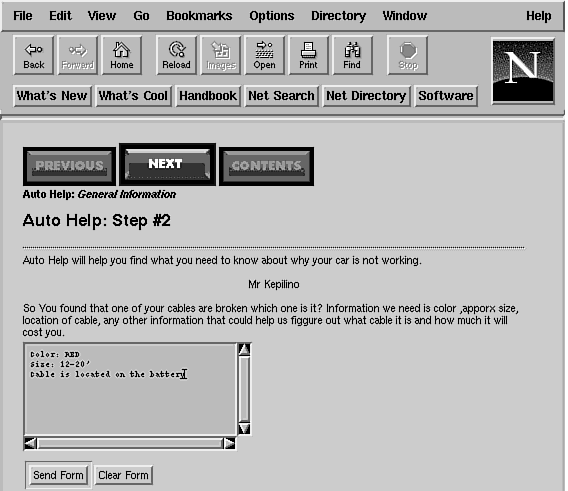 HTML forms are most programmers' first introduction to CGI scripting. Chapter 7, "Extending HTML's Capabilities with CGI," introduces formmail.pl, a CGI script that reads the contents of a form and sends it on to a designated recipient. As the complexity of the form grows, some Webmasters want to split it so that each page of the form depends upon the answers to the page before it. To build a multipart form, the concept of "state" must be added to HTTP.