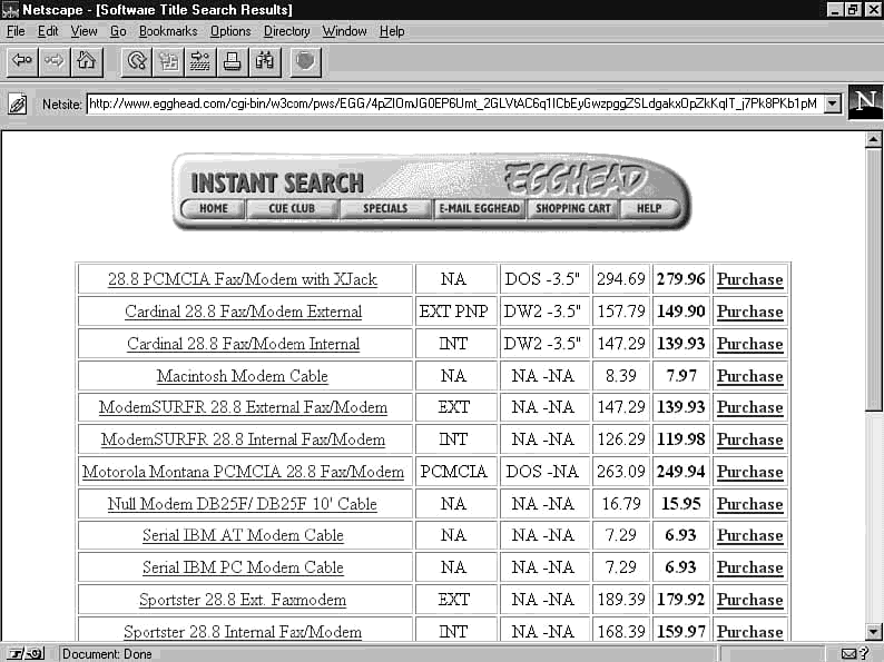 More than likely, your users will be looking for "something like" or "something that has the word 'modem' in it" rather than searching for a specific instance. In that case, the search engine should be designed to return more than one possible answer, giving the user the opportunity to pick from the results. Figure 18.1 is an example of such a catalog search, taken from the home site of Egghead Discount Software (http://www.egghead.com/).
