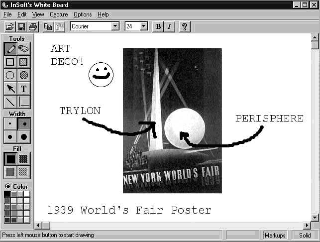 Because groupware relies on client-server communications, using the Web as the underlying protocol is a logical choice. The browser and Web server already have the necessary connection mechanism. All that's needed is some programming to handle data stored in a manner other than HTML. The Web White Board plug-ins for Netscape Navigator and Internet Explorer are examples of such programming: users all work on the same graphic on the board, with each user's changes being reflected to the others. In addition, the white board supports a text-based chat channel that permits typed messages to be reflected to all members in the group. Figure 22.1 is an example of CoolTalk, Netscape's Internet phone plug-in that includes a Web-based white board.